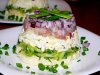 Если любите селедку с уксусом, предварительно замаринуйте ее (сбрызните уже нарезанные ломтики) и потом выкладывайте в тарелку. Допускается и лук. Его нужно мелко нарезать, смешать с селедочным филе и выкладывать в центр тарелки.
